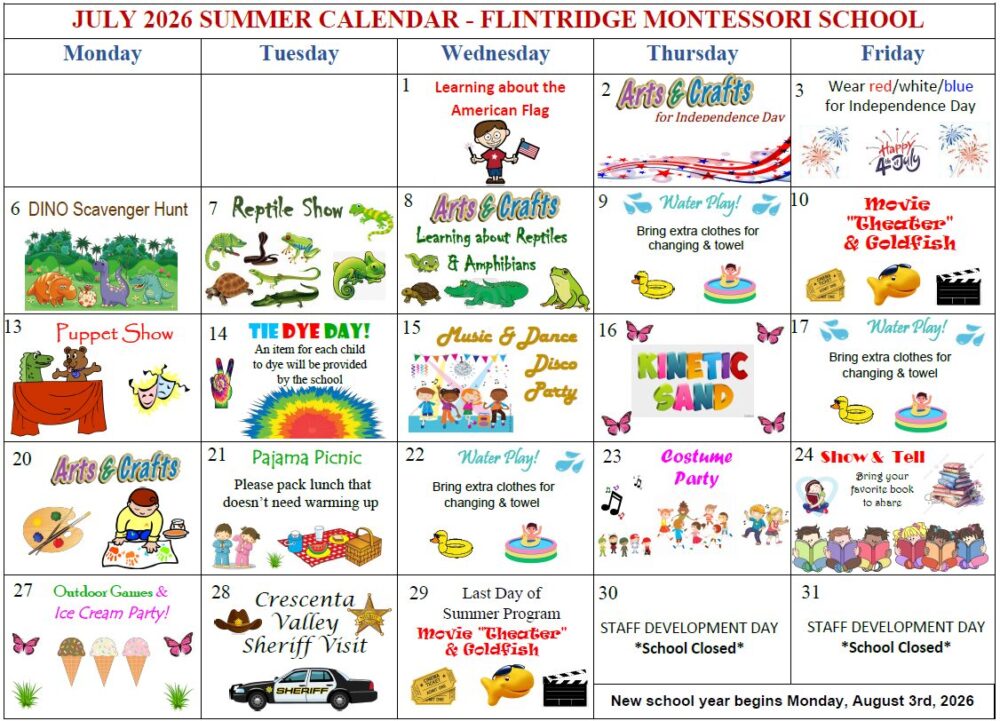 During June and July, we offer an exciting and eventful summer program where children learn while having fun. While flourishing at a steady and relaxed pace, there are plenty of wonderful learning opportunities provided. Promoting freedom to explore creativity in the arts, crafts, music, academics, and leadership; while emphasizing the importance of plenty of physical activity to keep the mind sharp.